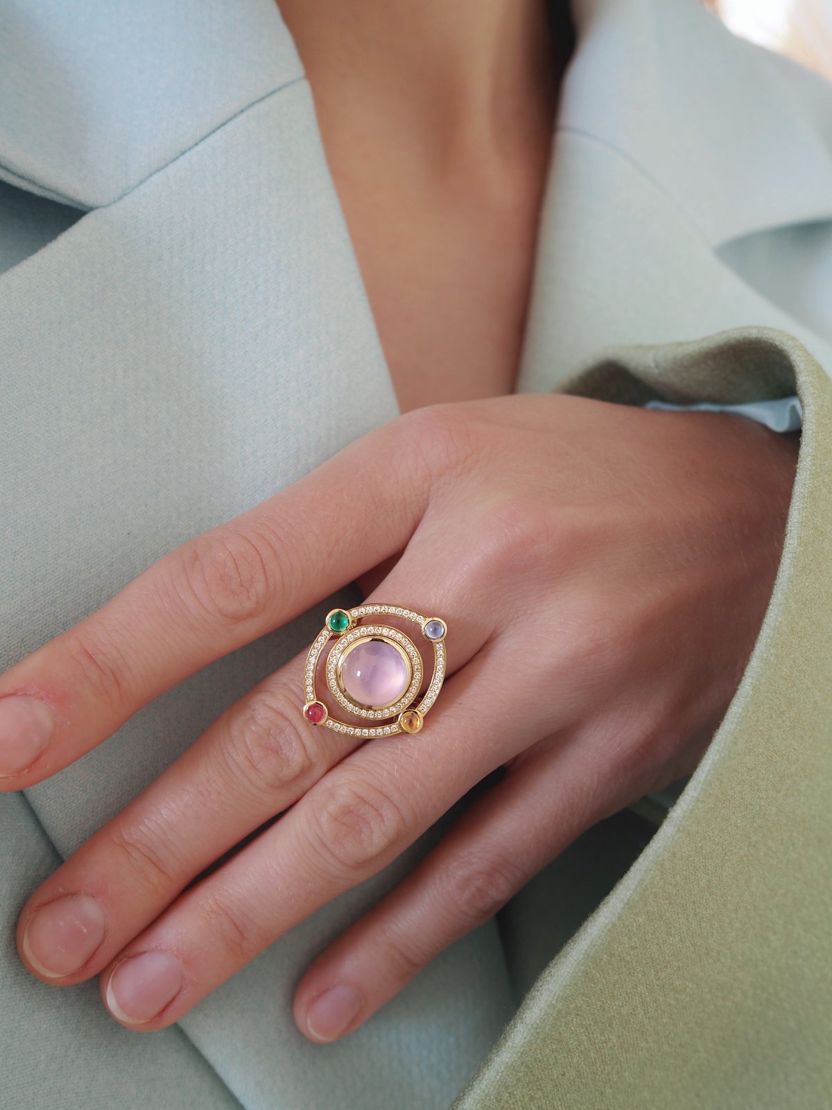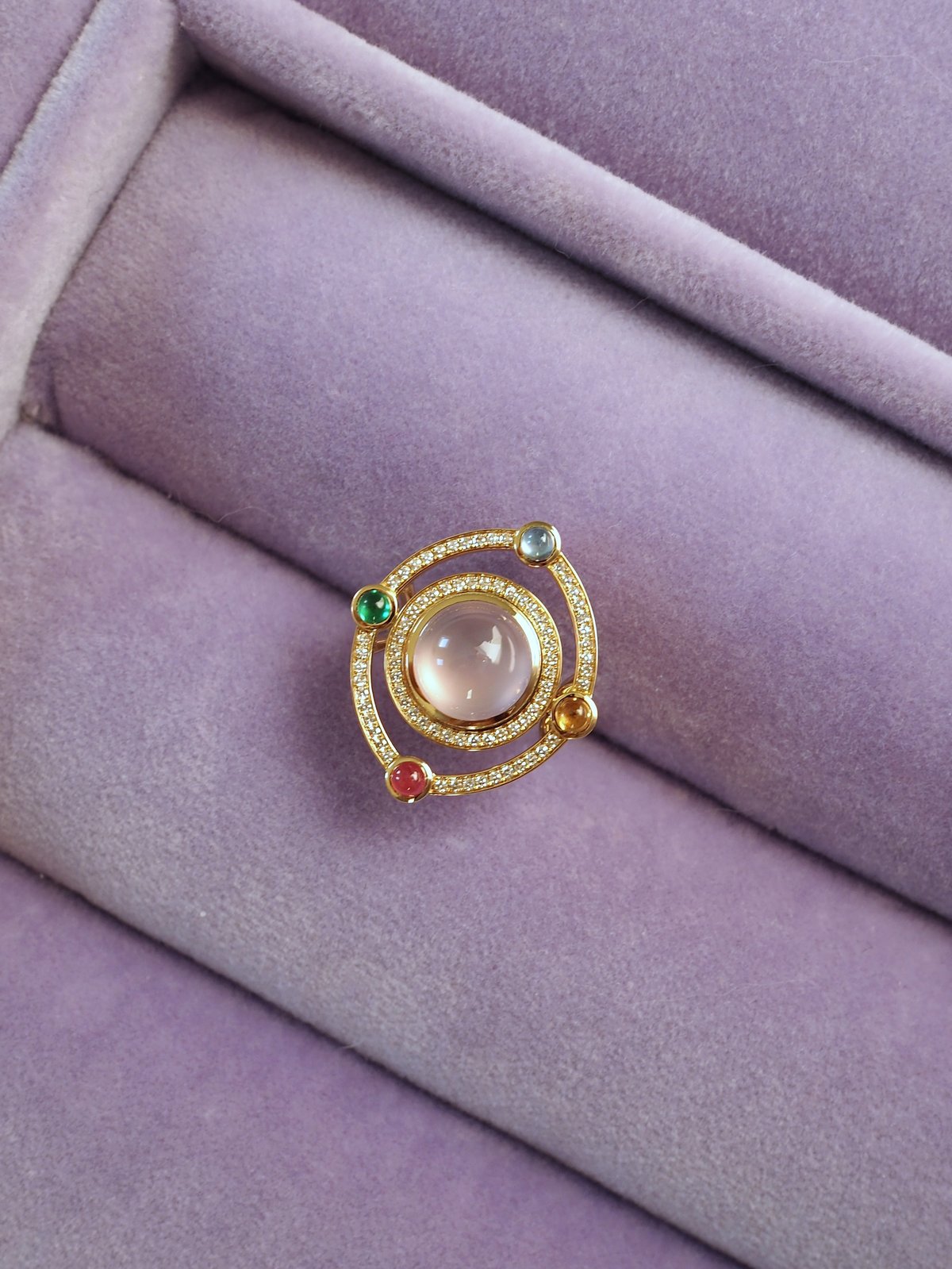 Materials Version 1: 18K yellow gold, single cut diamonds, center stone - chalcedony, side cabochons - blue & red sapphire, emerald & spessartite garnet